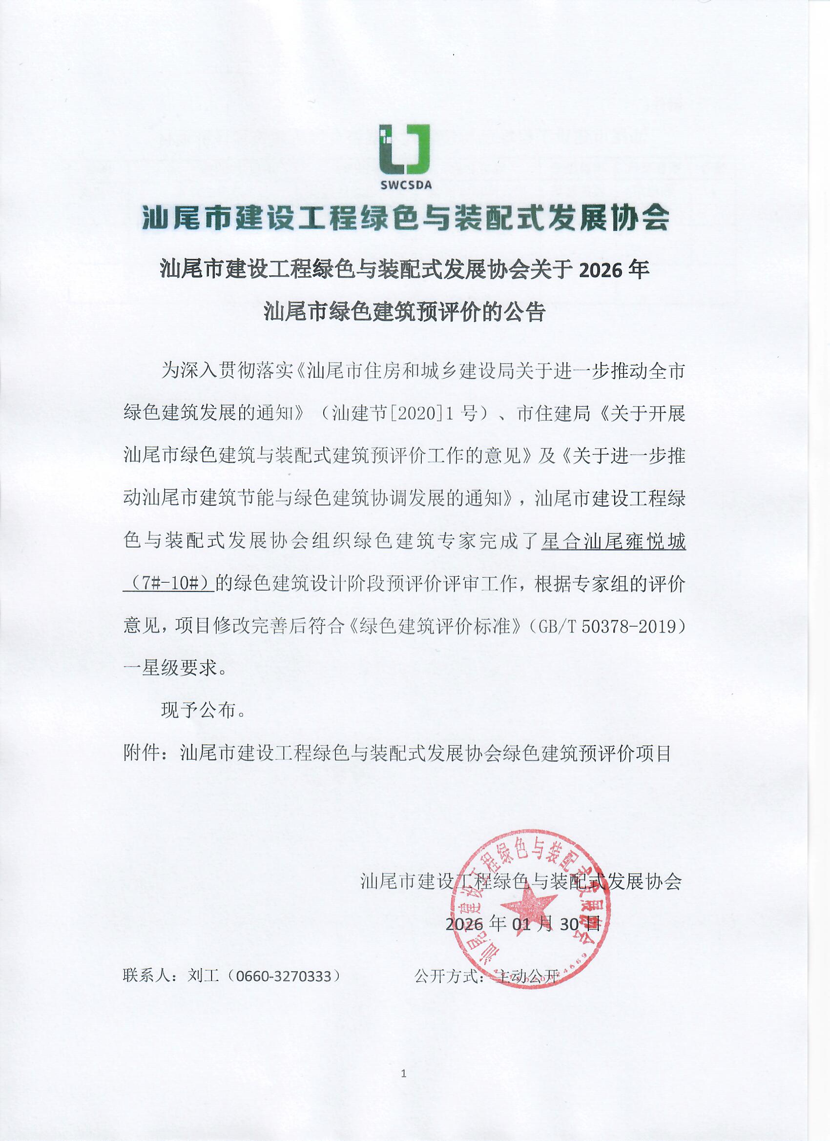 星合汕尾雍悦城(7#-10#)的绿色建筑预评价公告