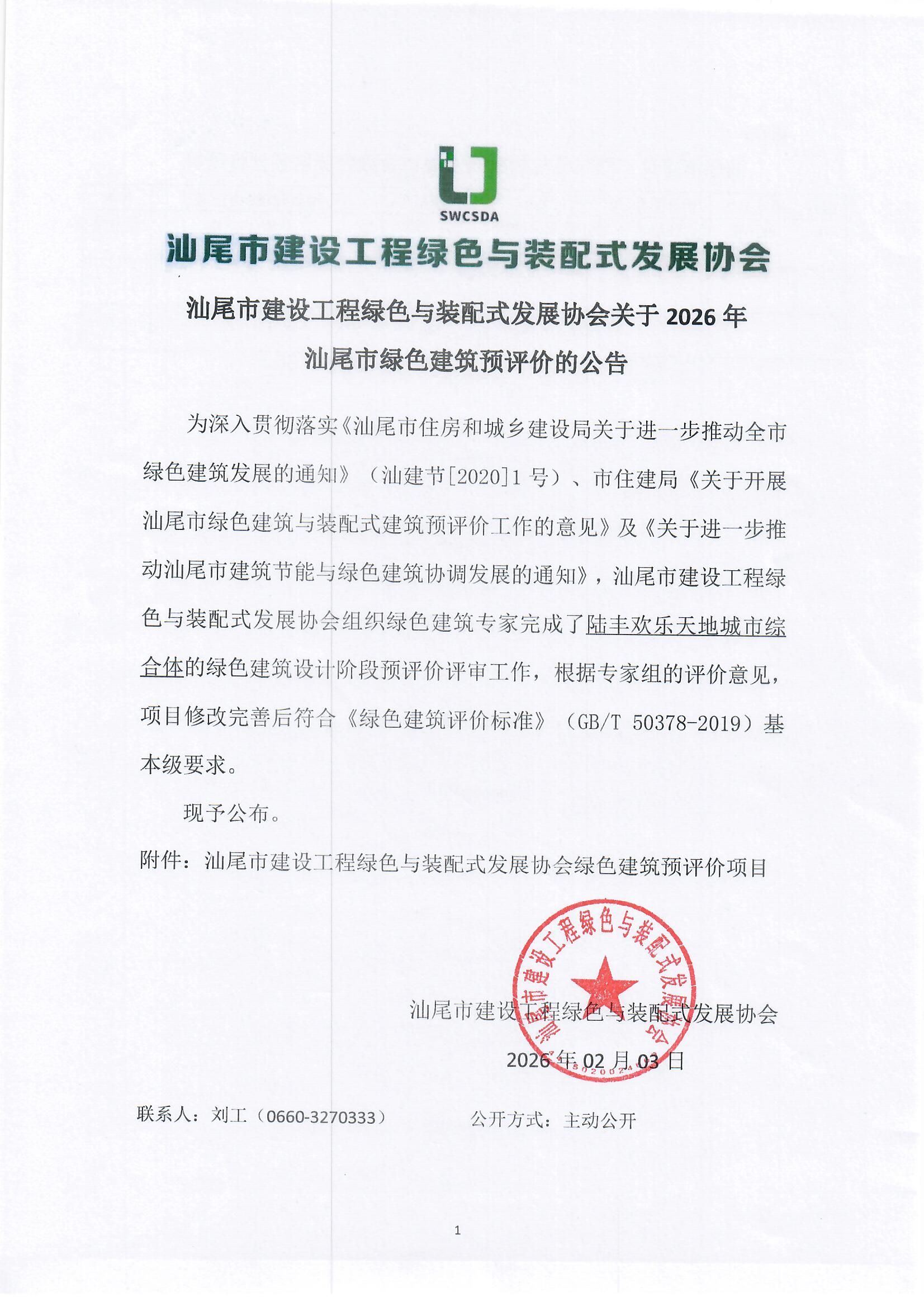 陆丰欢乐天地城市综合体的绿色建筑预评价公告